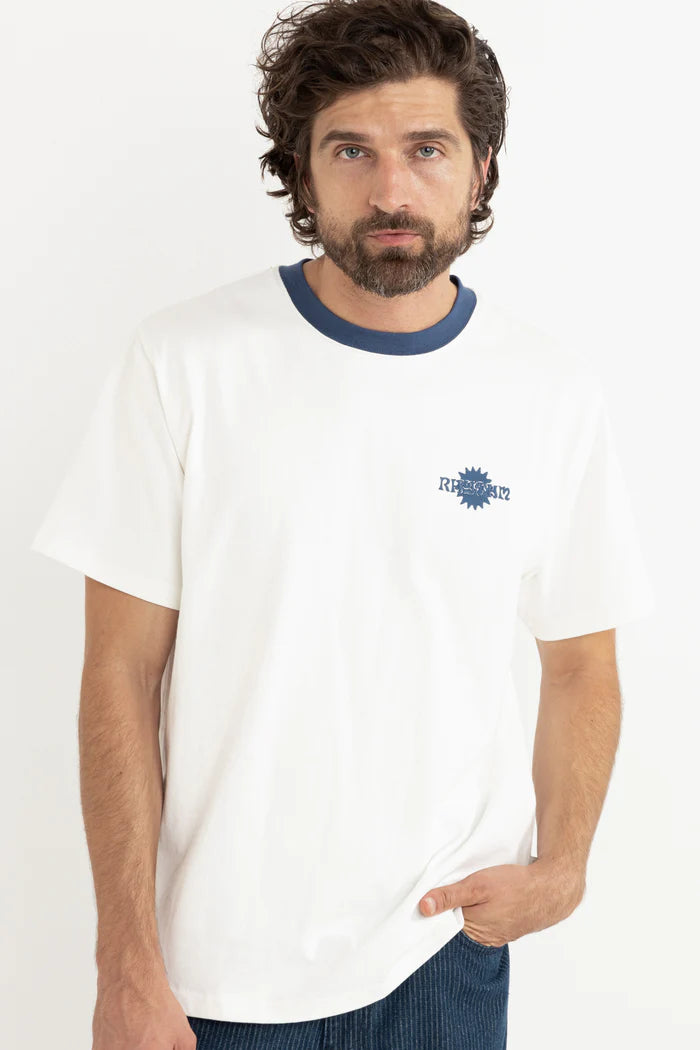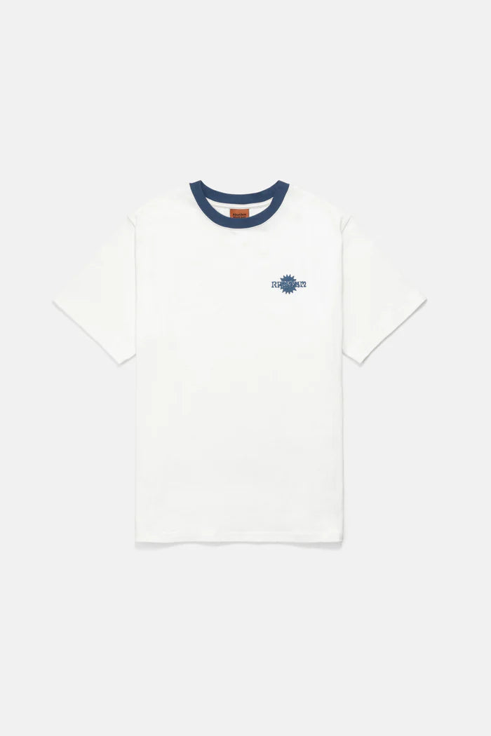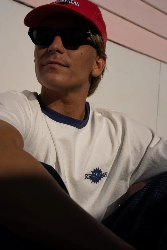 The Eclipse T-Shirt in Natural exudes understated charm. Featuring a band tee-inspired design with a contrasted collar and a small printed detail on the left chest, this piece pairs effortlessly with denim or trunks for a laid-back yet elevated look.