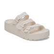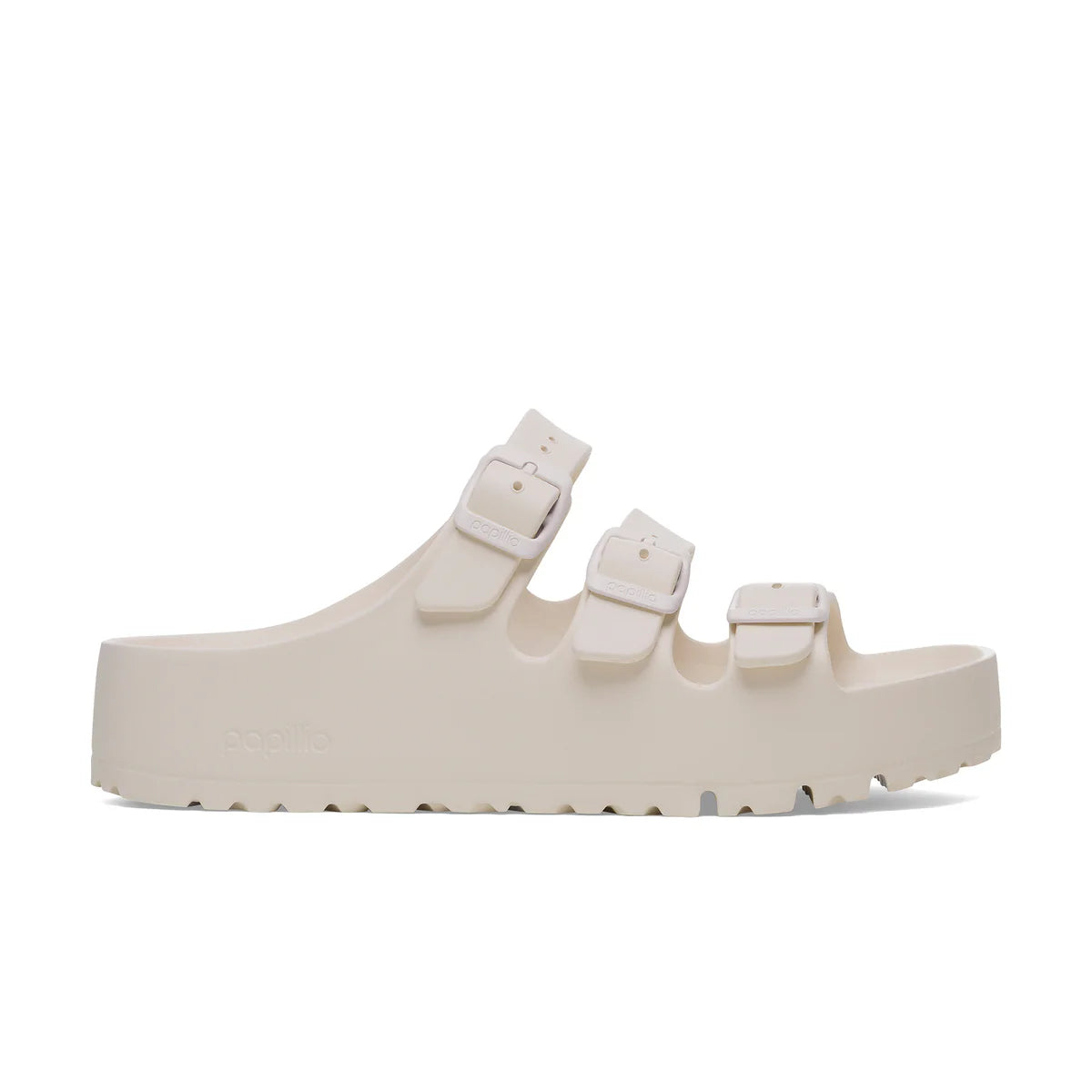 The Birkenstock Florida is the ideal sandal for anyone who spends a lot of time on their feet. This three-strap sandal offers good grip and maximum comfort. The new platform flex outsole has a wider heel section for increased stability and ideal weight distribution. The updated design with horizontal grooves in the front part improves flexibility and the rolling motion. Modeled on the cork original, this sandal is made from especially light and highly flexible EVA. This high-quality, odor-neutral synthetic material which has been tested for harmful substances is shock-absorbent, water-resistant, and skin-friendly. It is therefore perfect for wearing on the beach, in the garden, or in wellness and spa areas.