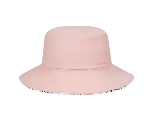 - The girls Connie ponytail bucket features a reversible design with a tropical leopard print design on one side and a plain pink fabric on the other.